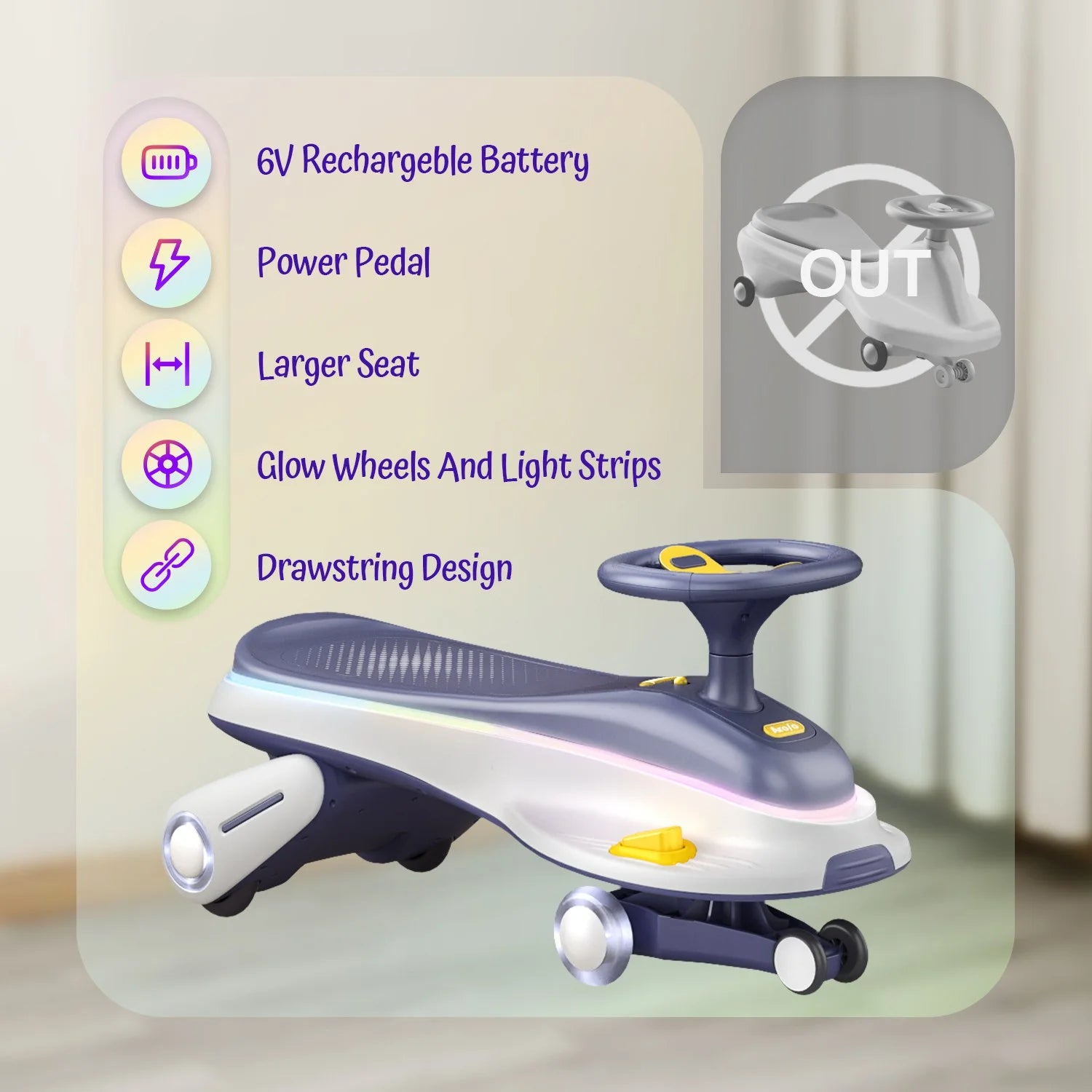 Spark endless adventures with the Babyomi Electric Wiggle Car, a dynamic 2-in-1 ride-on that combines thrilling motion and imaginative play. Designed for kids aged 3+, this white-blue glowing car features swing mode, music, and dual-speed control—perfect for indoor fun or outdoor exploration. Switch between electric-powered gliding (6V rechargeable battery) and manual pedal action for active play. The 2-speed settings adapt to your child’s confidence level, while glowing wheels light up every ride for eye-catching excitement. Built-in music and sound effects enhance imaginative adventures, and the anti-slip seat with ensures stability during swinging or driving. Durable ABS construction withstands rough play, and the ergonomic design supports up to 110 lbs.