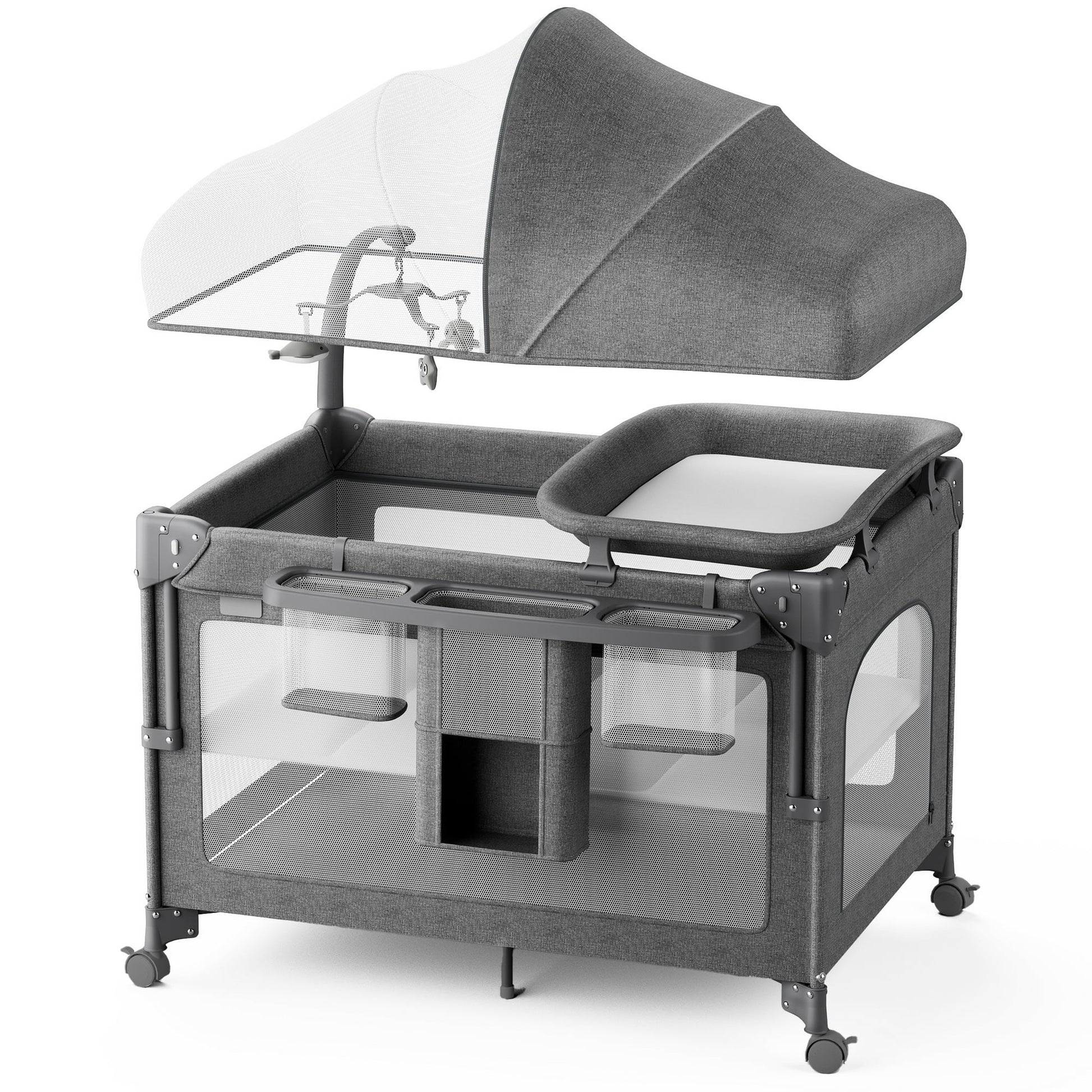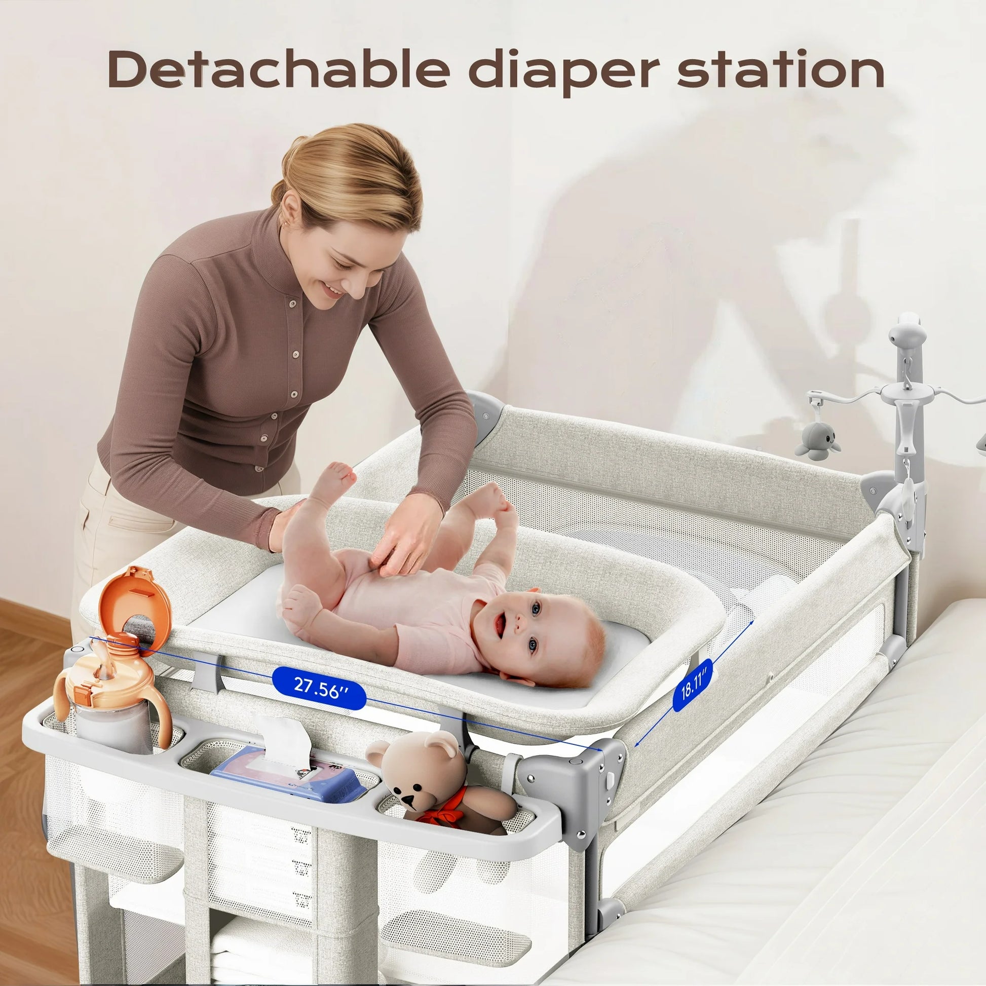 [5-in-1 Versatile Design]-Grow with your baby from birth to 24 months! This bassinet doubles as a bedside sleeper, portable crib, changing table, storage hub, and play space—saving you money and nursery space.