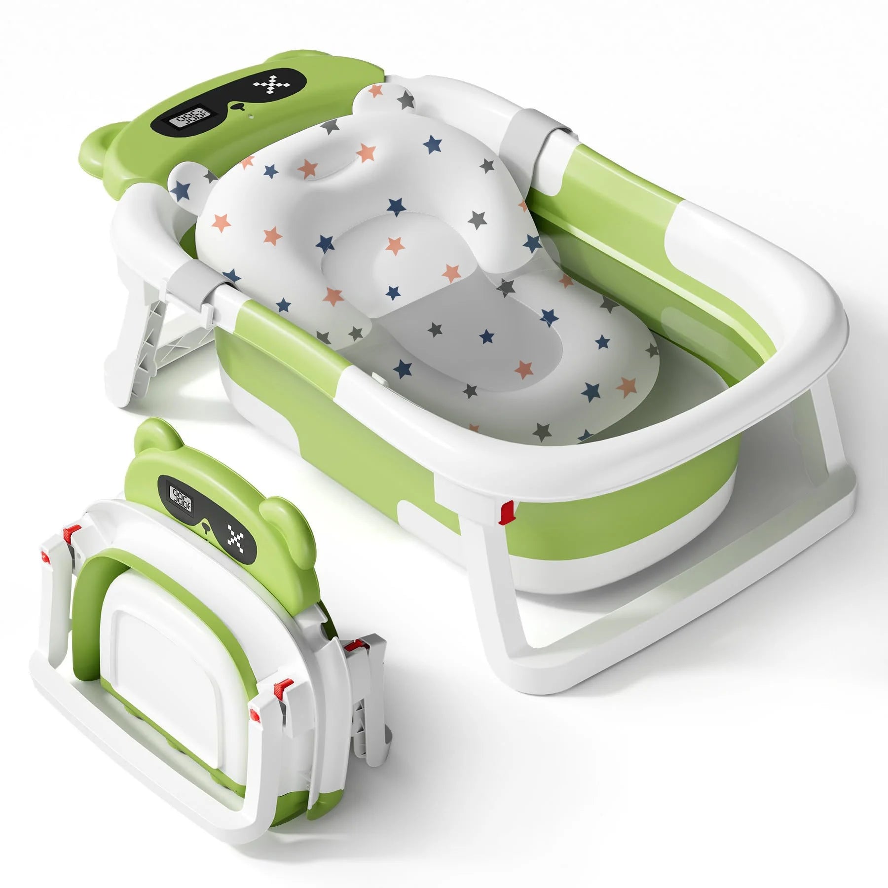 This baby bathtub is carefully designed for newborns to young children, with many highlights. The bathtub material is durable, providing reliable protection for baby bathing. Equipped with a cute little bear shaped thermometer, it can accurately monitor water temperature, prevent babies from crying due to uncomfortable water temperature, and always protect their delicate skin. Soft detachable cushion that fits the baby's body curves, providing a comfortable bathing experience and easy cleaning to maintain hygiene. The bottom of the bathtub is equipped with anti slip design and hanging function, saving space and facilitating storage. The included shower cap provides convenience for babies when washing their hair and reduces water flow stimulation. It is worth mentioning that the bathtub is foldable, making it very convenient for both home use and travel, easily solving the problem of baby bathing. It is a thoughtful choice for novice parents.